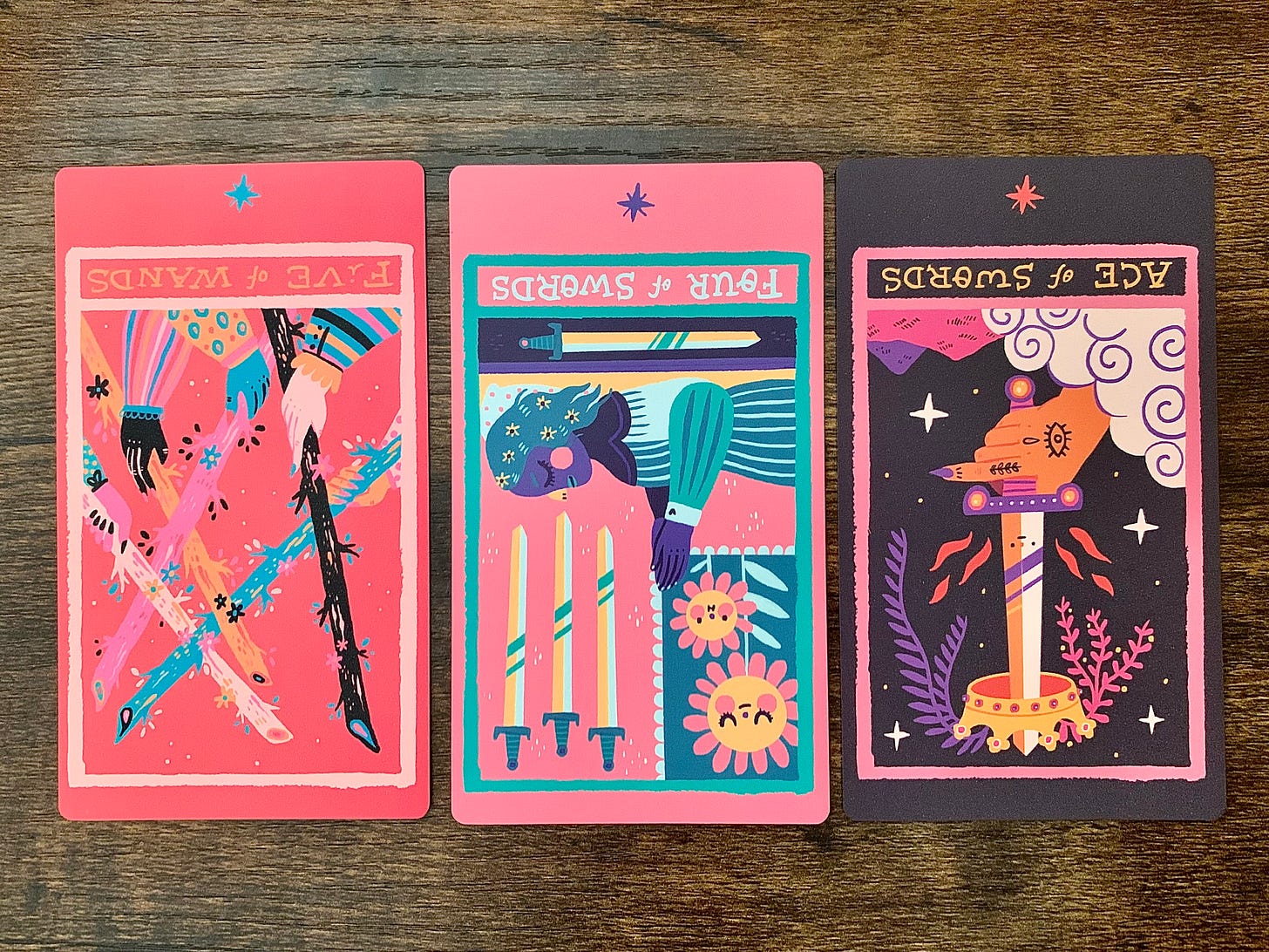 The V of Wands reversed is like energy being shifted, but not always in the most lighthearted or “resolution-y” kind of way. It can feel like the air leaking out of your balloon and you giving up and walking away disappointed. It can also feel like, instead of “friendly competition”, we’ve moved into “kill or be killed.”