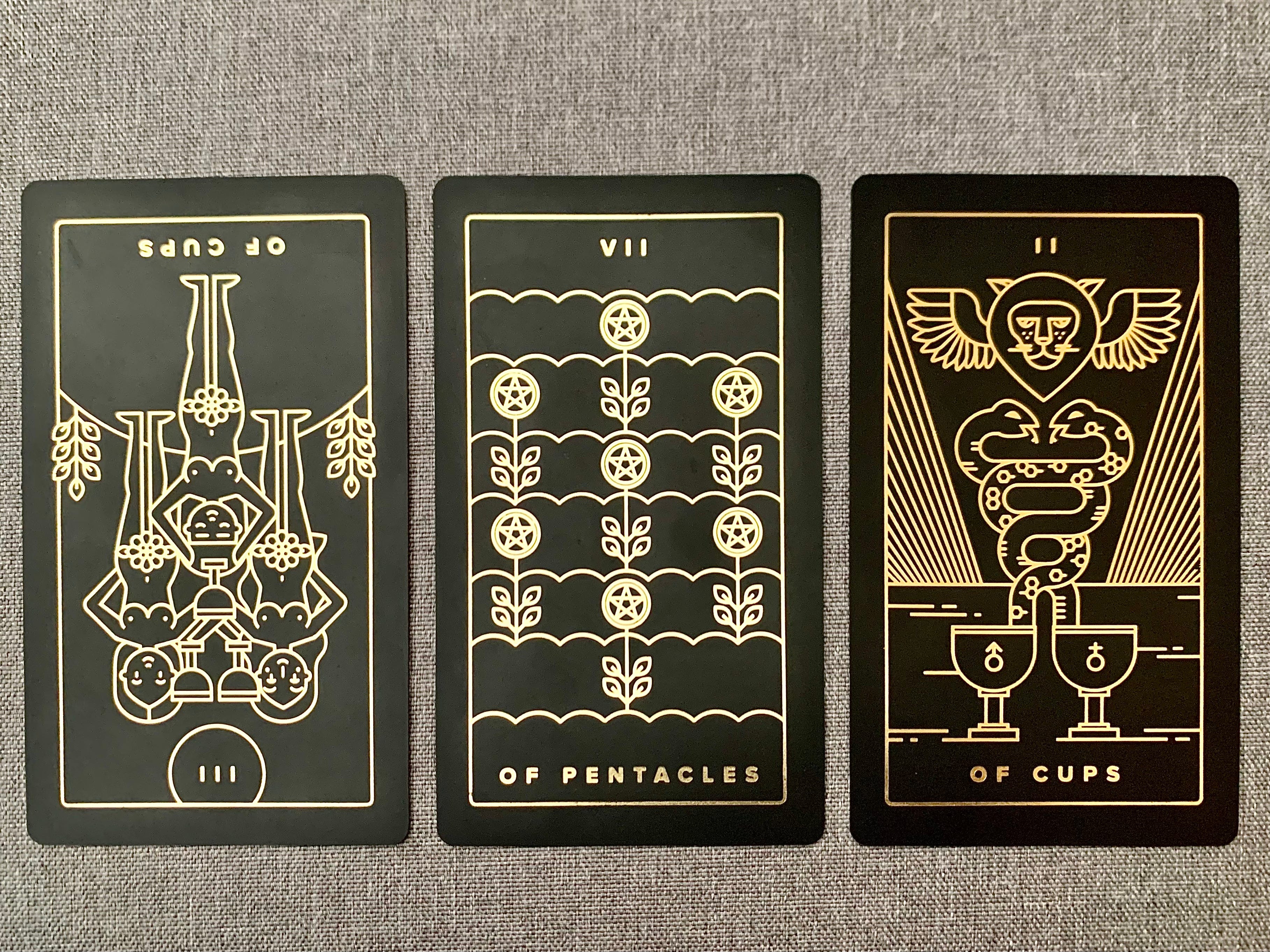 We’re about to walk into the Summer Solstice, with cardinal water sign Cancer leading the way and I think it’s so, so, sooooooo appropriate that this spread has two cards from the suit of Cups and one from the suit of Pentacles.